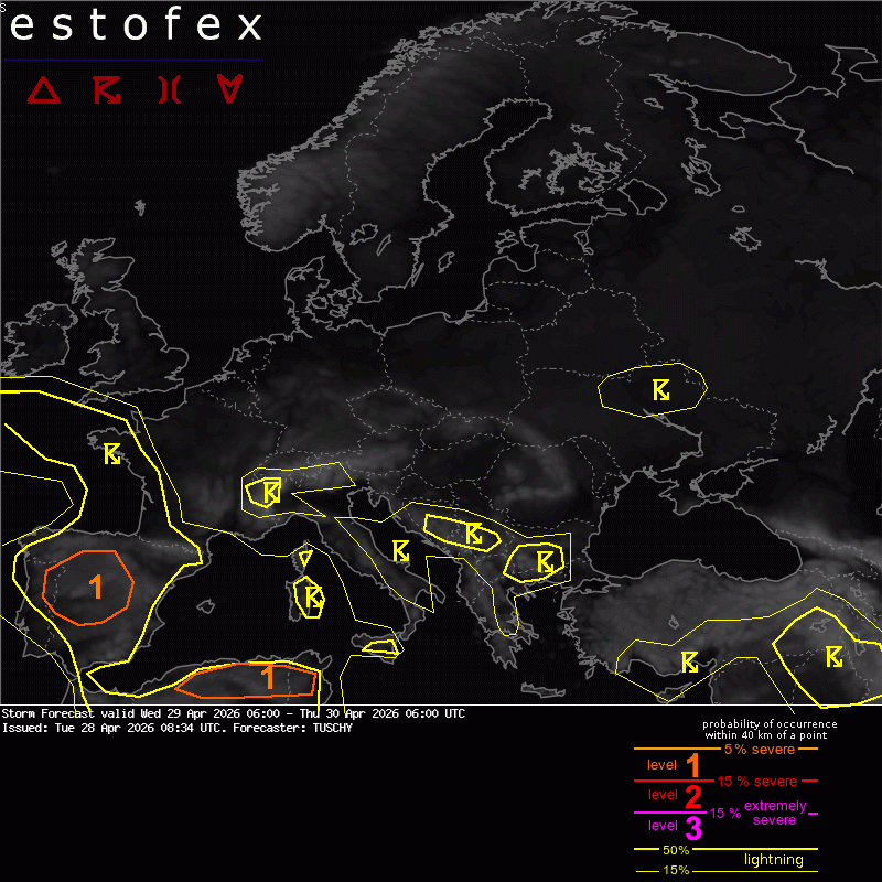 A level 1 was issued for parts of Spain and far NE Portugal mainly for a few large hail events.